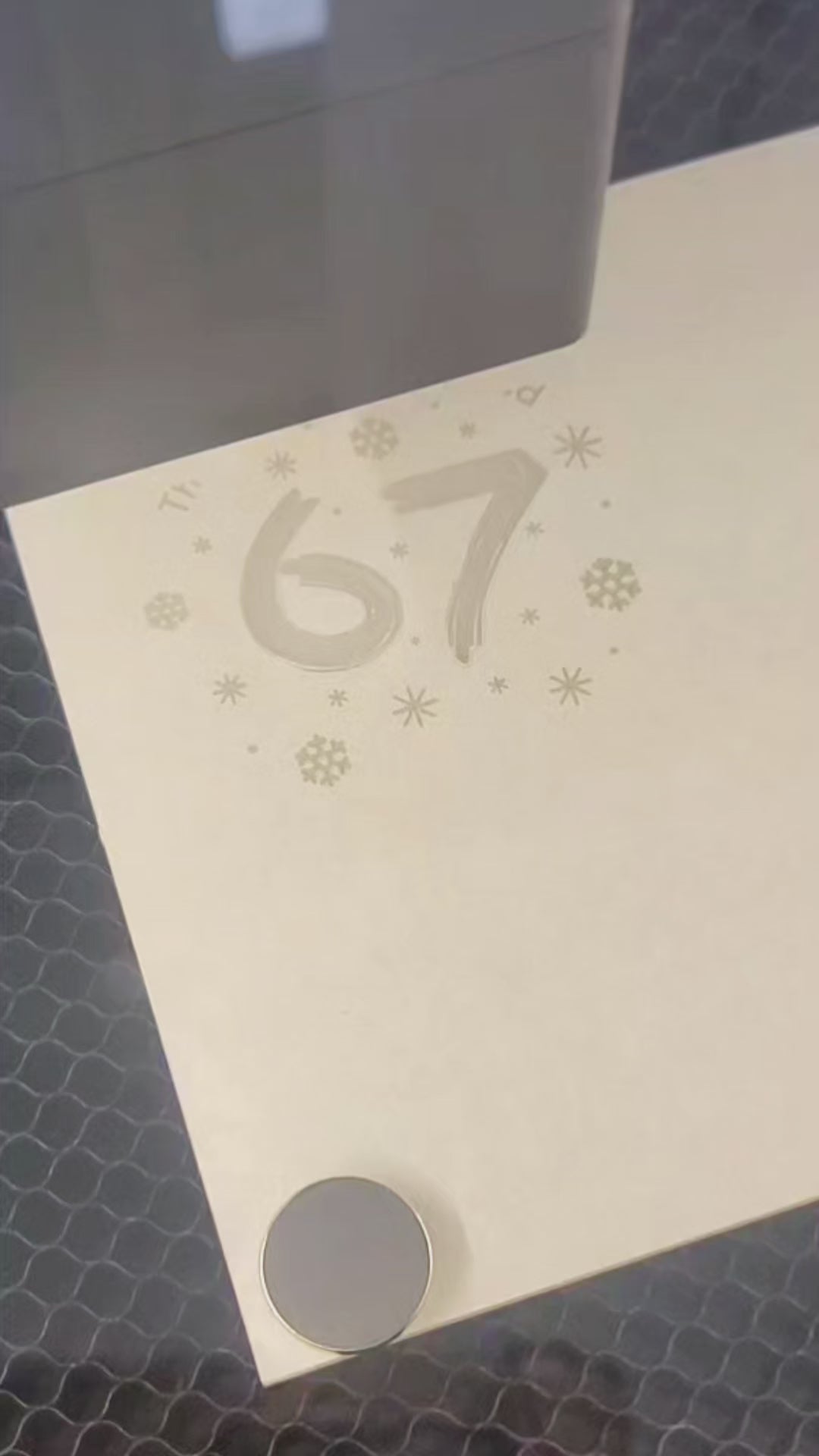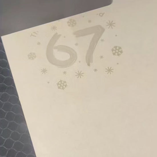 This ornament is made with laser-cut clear acrylic and framed with a light cherry wood outline, giving it that cozy, handcrafted holiday feel. Inside the snow globe, the number “67” is engraved front and center, surrounded by delicate snowflakes you can easily see through for a modern, minimalist look.