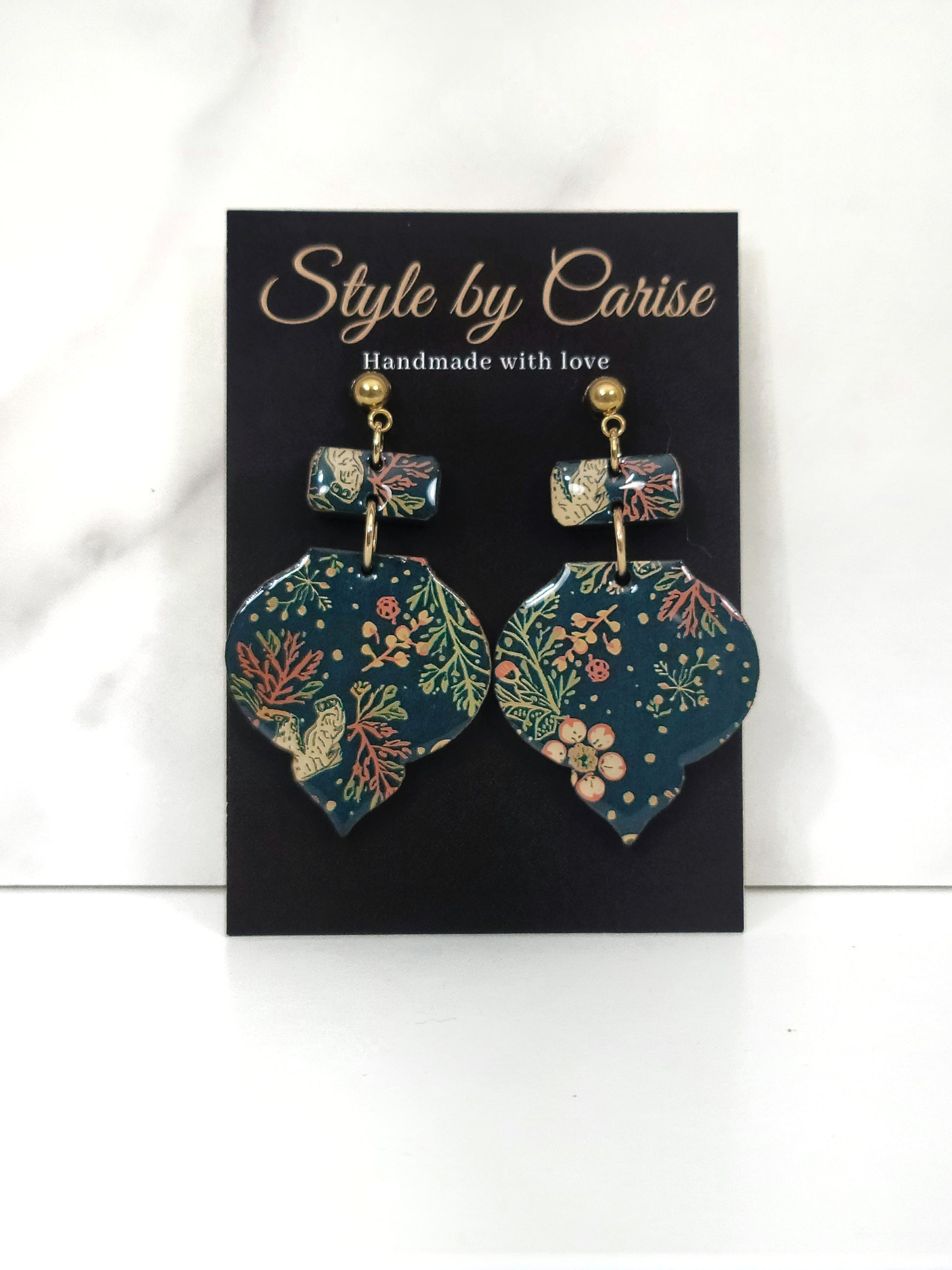 Handmade in a unique ornament silhouette, these earrings feature a stunning Christmas floral print I designed and sealed in crystal-clear resin for a glossy, long-lasting finish. Each piece is lightweight and comfortable for all-day wear — festive without the fuss.