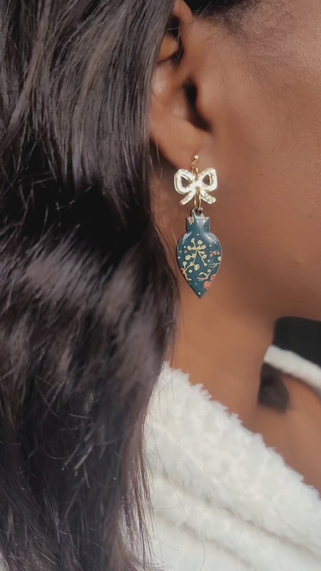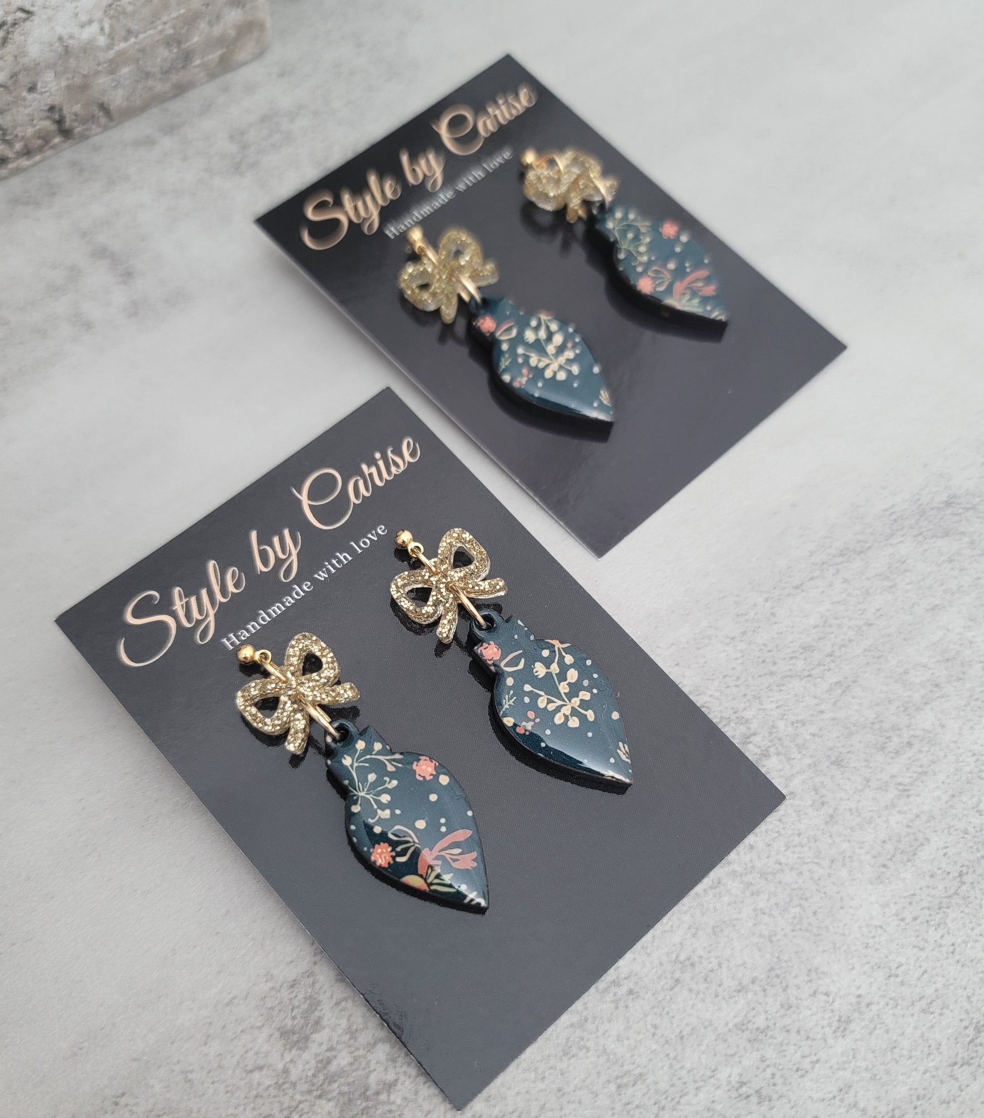 Handmade in the shape of Christmas lights, with a laser cut shimmery bow, these earrings feature a stunning Christmas floral print I designed and sealed in crystal-clear resin for a glossy, long-lasting finish. Each piece is lightweight and comfortable for all-day wear — festive without the fuss.